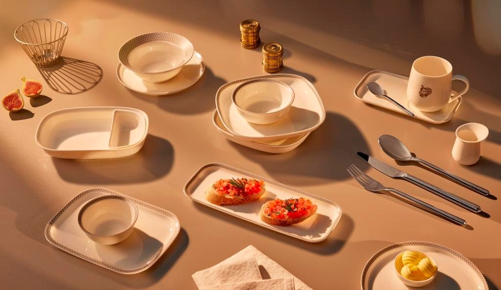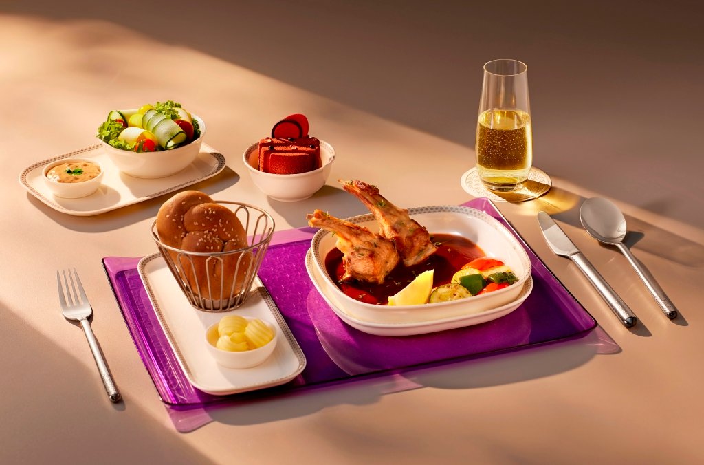Glassware and Cutlery: Business class guests will enjoy luxurious, lead-free glassware from Slovakia, which boasts infinite transparency, thanks to the use of a rare element of the highest quality erbium. Exquisite stainless-steel cutlery, featuring weight-saving hollow handles, will further elevate guests’ dining experience.