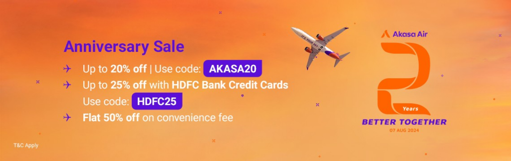 Use promocode ‘AKASA20’ to get a discount of up to 20% on basic fareUse promo code ‘HDFC25’ to get up to 25% on the basic fare for those booking through HDFC credit card or using