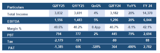 • Total Income at INR 3.8 bn, up 20% as compared to Q2 FY24