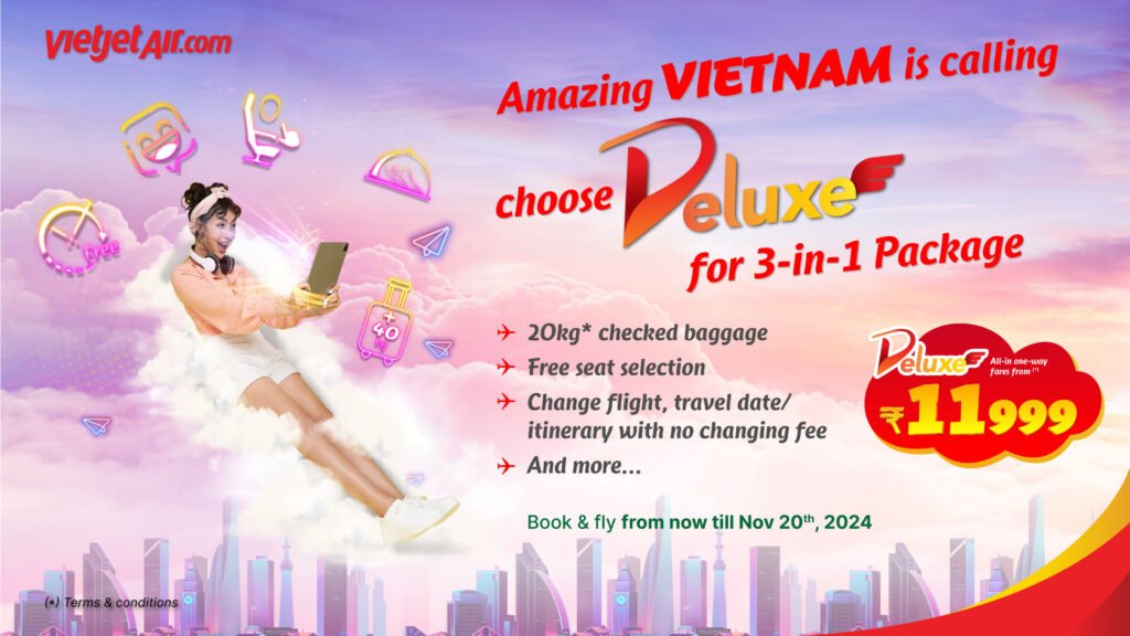 Flying with Vietjet’s Deluxe tickets offers Indian passengers a comprehensive 3-in-1 package that includes up to 20kg of free checked baggage, complimentary seat selection, and free flight schedule changes (*). With fares starting from just INR 11,999 (all-inclusive, one-way), bookings can be made easily through the official website www.vietjetair.com, the Vietjet Air app, or via authorized agents worldwide.