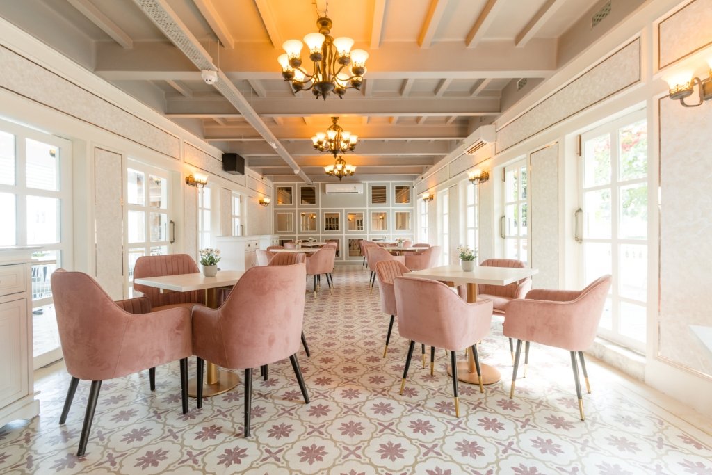 The colonial-style heritage building is now home to Milee Droog Coffee & Bistro. Spread across three floors, part indoor and part outdoor, the sprawling bistro boasts a seating capacity of almost 210 people. The ground floor is dedicated to coffee aficionados who can choose from an extensive menu. It also has an outdoor area and a water fountain feature. The first floor is where the bar, an outdoor balcony area, and a glass-enclosed PDR are all located. For internal promotional movies, Russian documentaries, and videos, this area also boasts a huge screen built that is 70-80 square feet in size. A sizable dining room and a balcony are on the second floor. There are open seating areas and covered glass houses on the third floor, where the terrace is. The 110-year-old structure exhibits Romanian architecture, with large pillars holding the structure straight up in the air. The modern interpretation of the art deco culture has been given a twist by the new interior. The interior of the building features checkerboard floors, white floral designs, and pastel and lime-hued pastels. A substantial percentage of the ancient building’s flooring was restored. The colour combination of off-white and rose gold is prominent in the design elements.