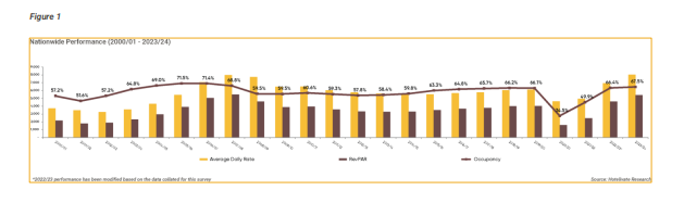 - Hotels charging average rates of ₹7,500 or more have increased from 23% (354 hotels) in 2022/23 to 30% (517 hotels) in 2023/24.
