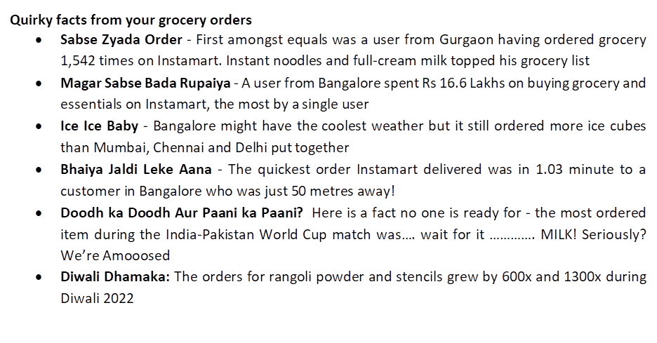 - For the first time new cities experienced the joy of getting their groceries delivered to them in minutes on Swiggy Instamart