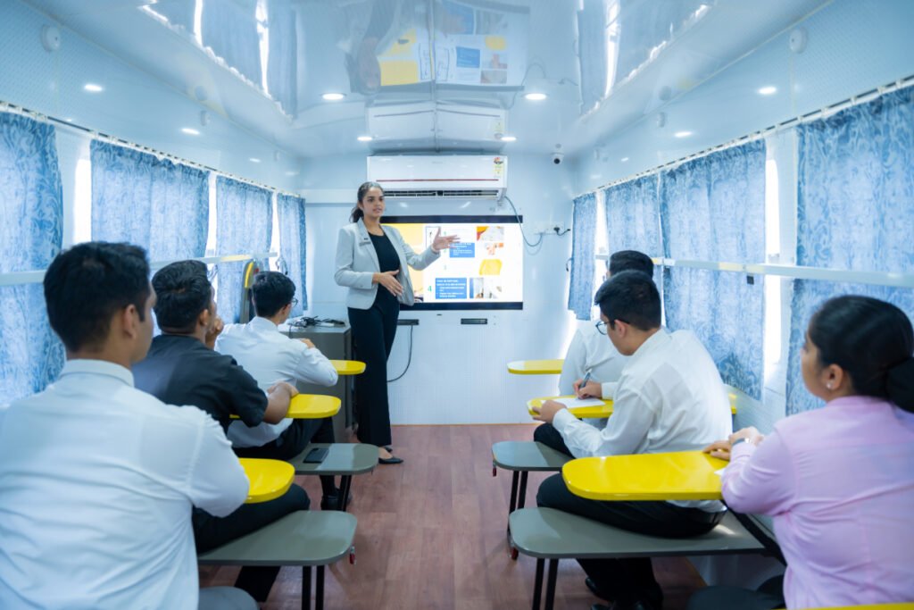 Under this project, they have 2 vehicles which are designed and well-equipped to carry out classroom sessions in any remote part of the country. The air-conditioned state-of-the-art vehicle is equipped with collapsible desks, benches, smart tv etc.