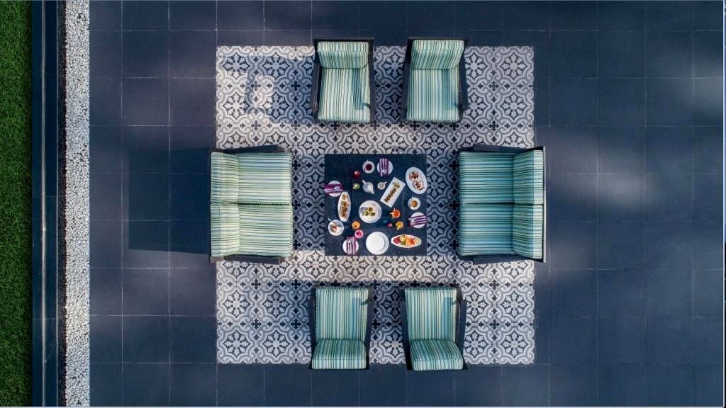 The original space underwent a truly remarkable transformation, now transformed into a spacious buffet area and open kitchen, meticulously designed to ensure a comfortable and uncrowded dining experience. For guest seating, a brand-new glass enclosure was skillfully added, extending into the exquisitely landscaped gardens, resulting in a dining experience unlike any other. The contemporary design language was vividly expressed through the use of vibrant, patterned tiles, intricate rattan work, and the introduction of a serene water feature.