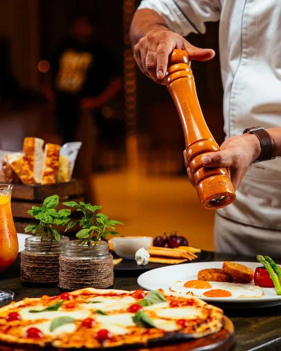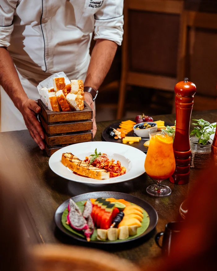 The brunch features an array of signature dishes meticulously curated to showcase the beauty of sustainable cuisine covering Cantaloupe Station, fresh, locally sourced cantaloupe presented in an elegant and refreshing display. This dish emphasizes the use of seasonal fruits, reducing carbon footprint and supporting local farmers. Watermelon Rind Koshambir, a unique salad made from watermelon rind, demonstrates our commitment to minimizing food waste. Blended with yoghurt, mustard seeds, and fresh herbs, this dish is both sustainable and flavorful. Sasam Salad, A vibrant salad featuring an assortment of fresh, seasonal vegetables, dressed with a mustard seed vinaigrette. This dish celebrates the diversity and bounty of local produce.