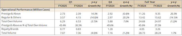 - Prestige & Above brands volume of 2.73 Million Cases (+14.3%)