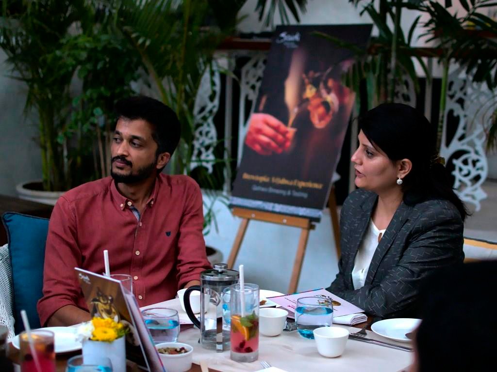 The event featured a demonstration of traditional qahwa preparation on a stovetop, illustrating the cultural connection between India and Saudi. The brewing process mirrors the method used in India, using spices once traded on historic routes. Guests explored the fusion using a French press under the expert guidance of Ganga and Pavan, founders of Coffee Mechanics and Kana. Once brewed, the qahwa was served in miniature ceramic cups from a traditional brass Dallah paired with Medjool dates, offering guests a taste of authentic Saudi hospitality or Hafawah.
