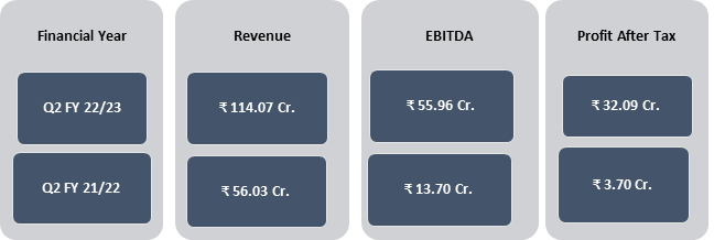 - Reported revenue of INR 114.07 crores in Q2 FY22-23, which has more than doubled over Q2 FY21-22. The H1 FY22-23 revenue was 200.54 crores versus 81 crores in H1 FY21-22.