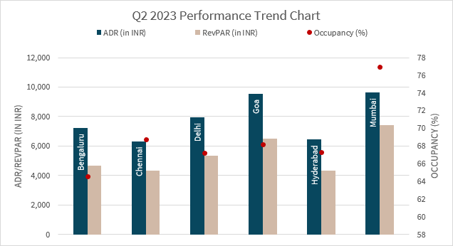 Apart from Bengaluru’s marginal drop in occupancy levels amidst summer vacations, the rest of the markets continue to display significant growth in ADR and RevPAR figures. Whilst occupancy levels remain fairly the same in Q2 2023 as compared to Q2 2022, ADR levels have picked up, subsequently pulling up the RevPAR levels across all the 6 major markets.
