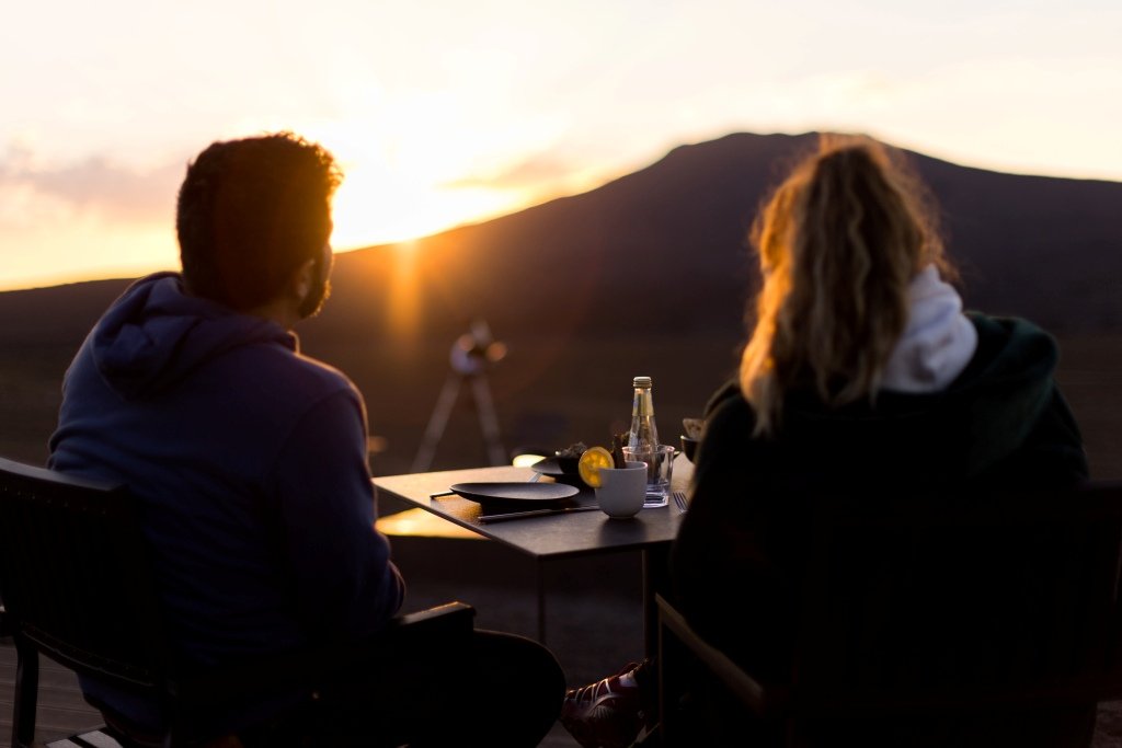 The ten luxury tented suites feature exquisitely designed interiors, including modern furnishings and bespoke comforts. Khaybar Volcano Camp also offers guests upscale details such as supremely comfortable beds and luxe amenities. Built harmoniously into the dramatic landscape, the colour scheme compliments the surrounding stark black basalt and white volcanic craters. Each room features private wooden decks where guests can view the surrounding vistas, epic sunrises, and illuminated evening skies.