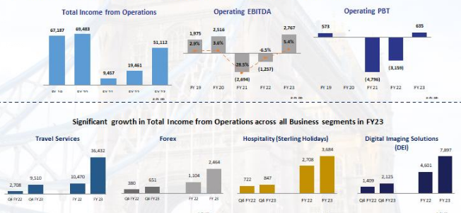 - Robust growth across all business segments in FY23; Income from operations growth (YoY): Forex: 123%, Travel: 248%, Hospitality (Sterling Holidays): 36%, Digital Imaging Solutions (DEI): 72%
