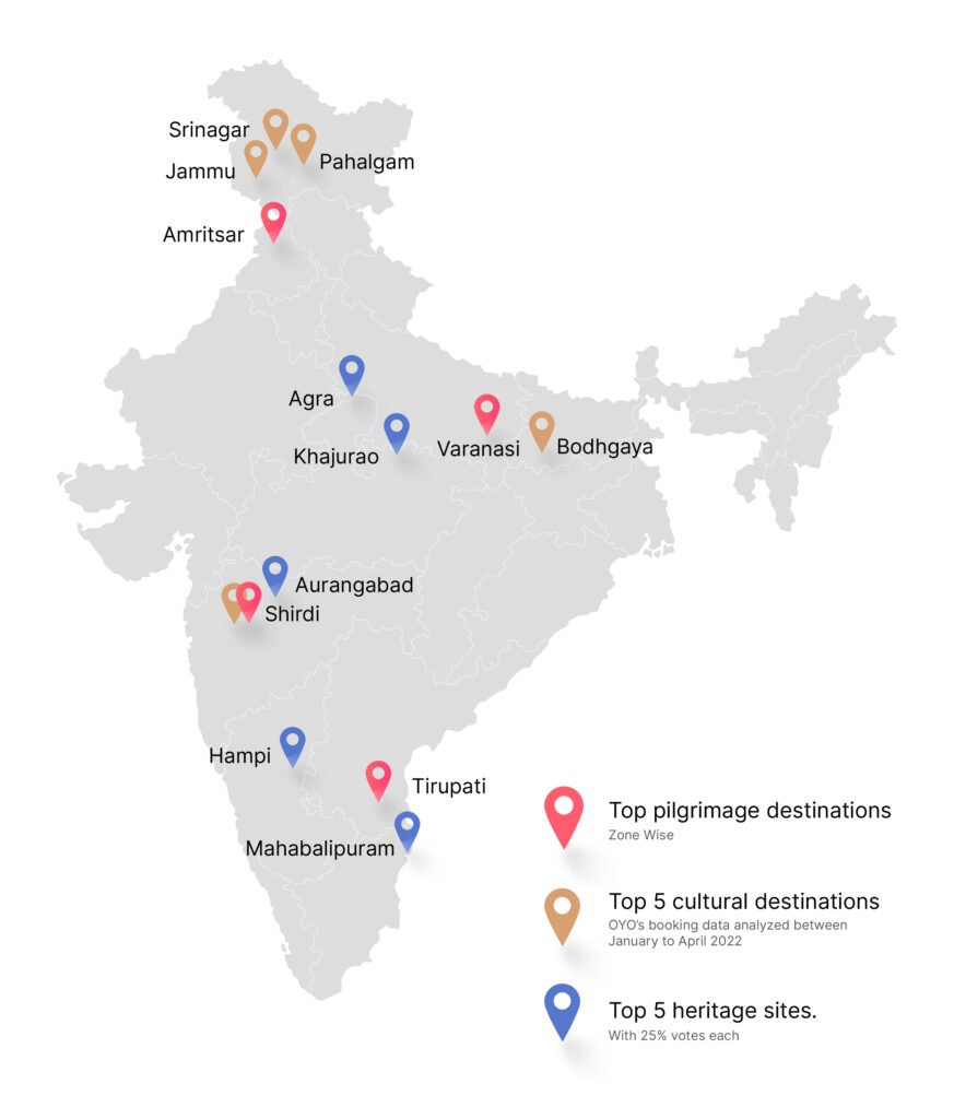 As per OYO’s booking data analyzed between January to April 2022, Srinagar, Pahalgam, Bodhgaya, Shirdi and Jammu are among India’s top 5 cultural destinations in order of ranking. India is known for its spirituality around the world. Within the culture-travel category, OYO’s data highlights rising consumer interest in pilgrimage and heritage destinations. Varanasi, seen by many as the spiritual hub, tops the charts as the most popular pilgrimage destination in India in 2022. This is followed by Tirupati, Puri, Amritsar and Shirdi. Besides this, OYO’s Mid-Summer Vacation Index also highlights keen consumer interest in visiting Vaishno Devi this summer.